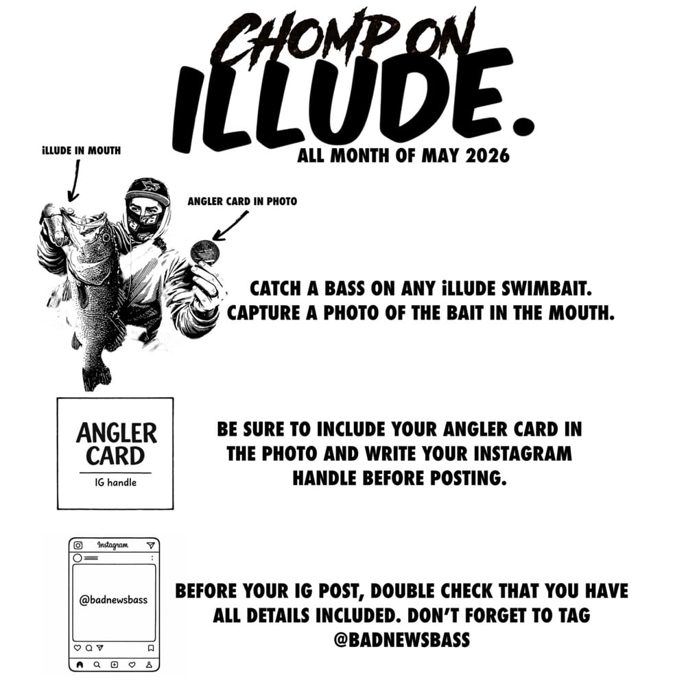 CHOMP ON ILLUDE is an online Instagram fishing competition where registered anglers have the chance to win swimbait prizes by catching qualifying bass using ILLUDE swimbaits.